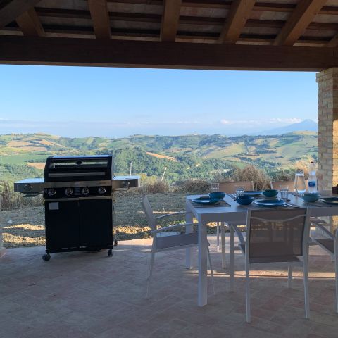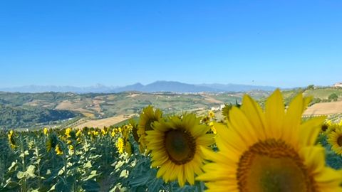 Unsere traumhafte Loggia und Terrasse, die sich von Osten bis nach Westen ums Haus ziehen, bieten viele individuelle Plätzchen zum Entspannen und Genießen des atemberaubenden Panoramas der südlichen Marken. Welliges Hügelland mit Sonnenblumenfeldern und Weinbergen wird von den Bergketten begrenzt. Ein Ausblick, der nie seinen Charme verliert.