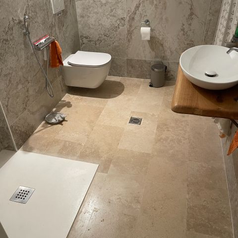 Travertin im ganzen Erdgeschoss und Eichenböden in den oberen Schlafräumen sind im Sommer kühl und dank der Fußbodenheizung im Winter angenehm warm.