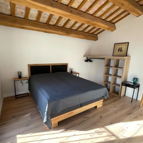 Das große ebenerdige Schlafzimmer mit Tür zur Westloggia und Fenster nach Westen haben wir so eingerichtet, dass das Bett auf einer Seite mit dem Rollstuhl anfahrbar ist.
