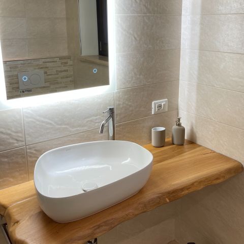 Unsere Waschtische sind maßgefertigte Unikate aus Eichenholz, die Waschbecken von Villeroy & Boch und VitrA.